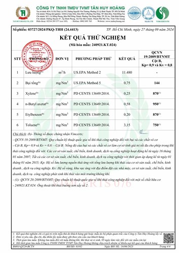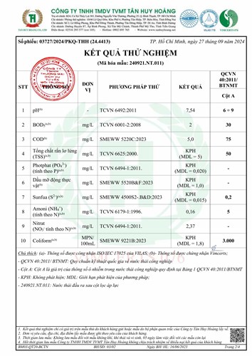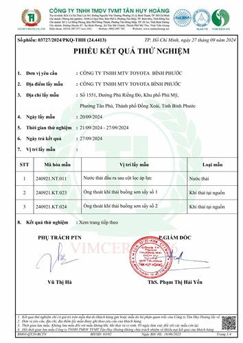 Kết quả quan trắc chất thải tự động, liên tục của Công ty TNHH Một Thành Viên Toyota Bình Phước tháng 09/2024