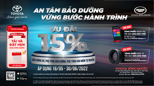 - Tặng phiếu dịch vụ trị giá 200.000 đồng sử dụng cho lần dịch vụ tiếp theo trong vòng 6 tháng kể từ ngày xuất phiếu, hoàn thành sửa chữa, bảo dưỡng xe tại đại lý Toyota Bình Phước theo lịch hẹn và có giá trị dịch vụ