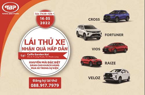 Nhằm mang lại sự tiện lợi cho khách hàng đang sử dụng thương hiệu xe Toyota Trên địa bàn Thị xã Phước Long cũng như toàn thể khách hàng cần mua xe thương hiệu Toyota trong thời gian tới. Toyota Bình Phước tổ chức chương trình lái thử các dòng xe Toyota vào ngày 14/05/2022